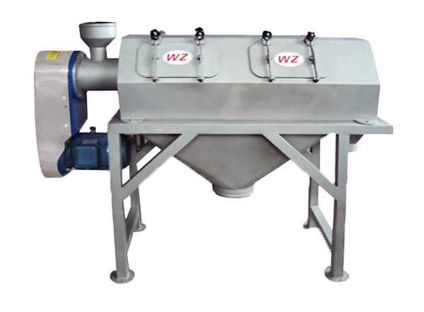 QXS臥式氣旋篩由于形狀為橫臥狀所以也叫臥式氣流篩或臥式氣流篩粉機,篩網為圓筒狀,置于機體內,物料通過螺旋輸送系統后,和氣流混合、霧化進入網筒內;通過網筒內風輪葉片使物料同時受離心力和旋風推進力,從而使物料噴射過網,由細料排出口排出,不能過網的物料沿網筒壁從粗料排出口排出。